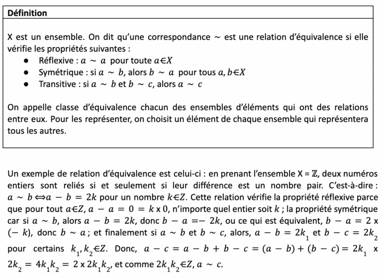Car, si le nombre est pair, il sera relié à 0, et si le nombre est impair, il sera relié à 1. Il y a donc deux classes d’équivalence.